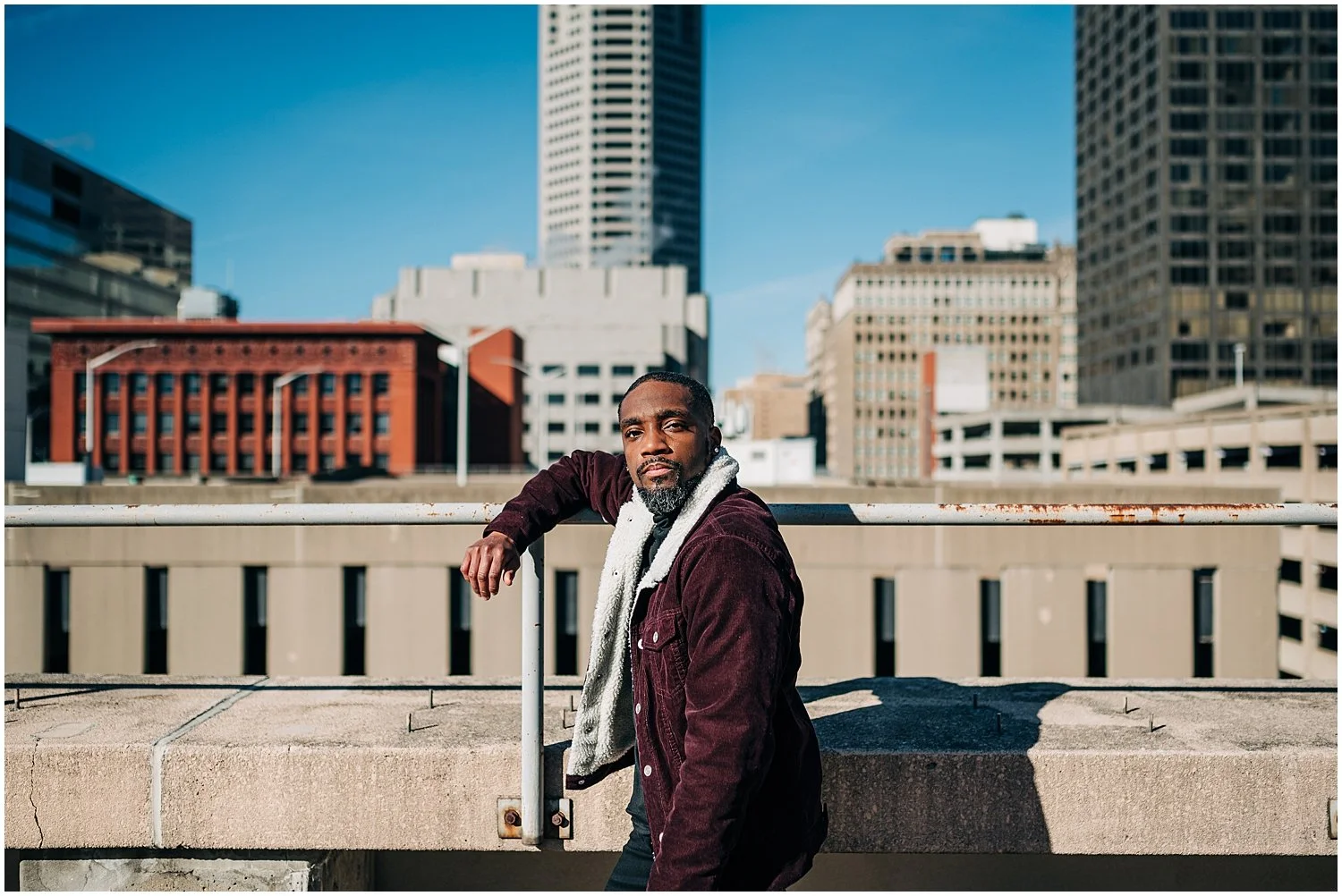 We shot Jordan’s session on a Saturday morning in late January. The weather had been gloomy and frigid all week. That morning, the sun came up in full swing and brightened the entire day. It couldn’t have worked out more perfectly. Although it was still freezing cold, Jordan powered through and you couldn’t even tell if he was cold. We shot on a rooftop in downtown St. Louis with several beautiful city views.
